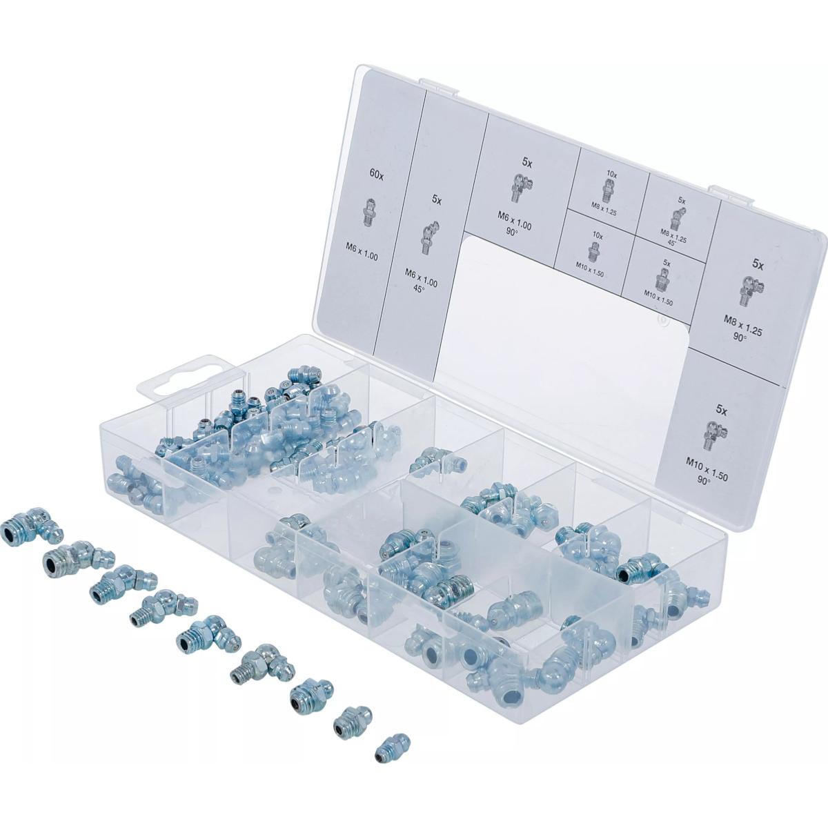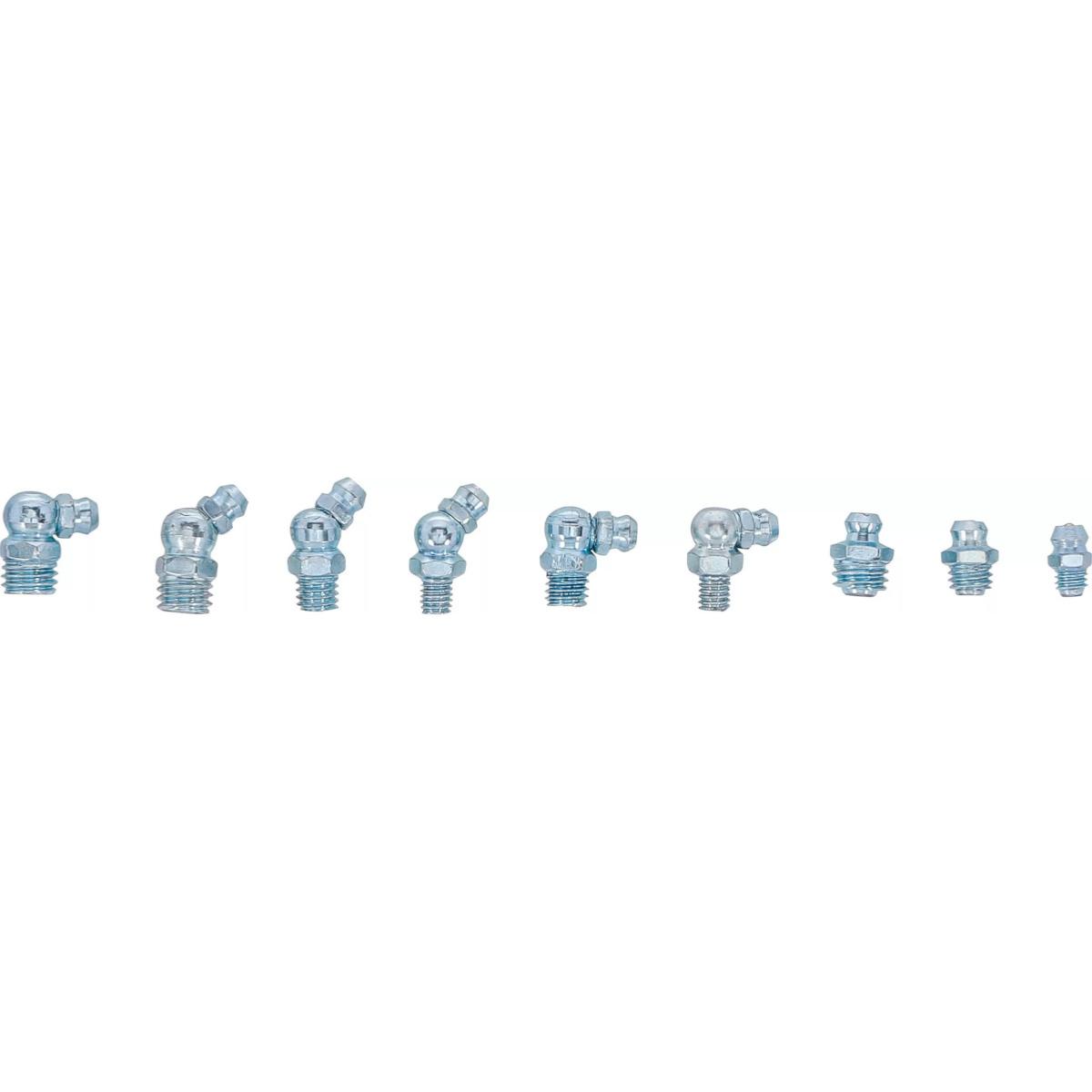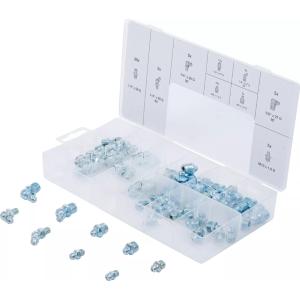 Assortiment de 110 graisseurs métriques droits et coudés pour pompe à graisse.