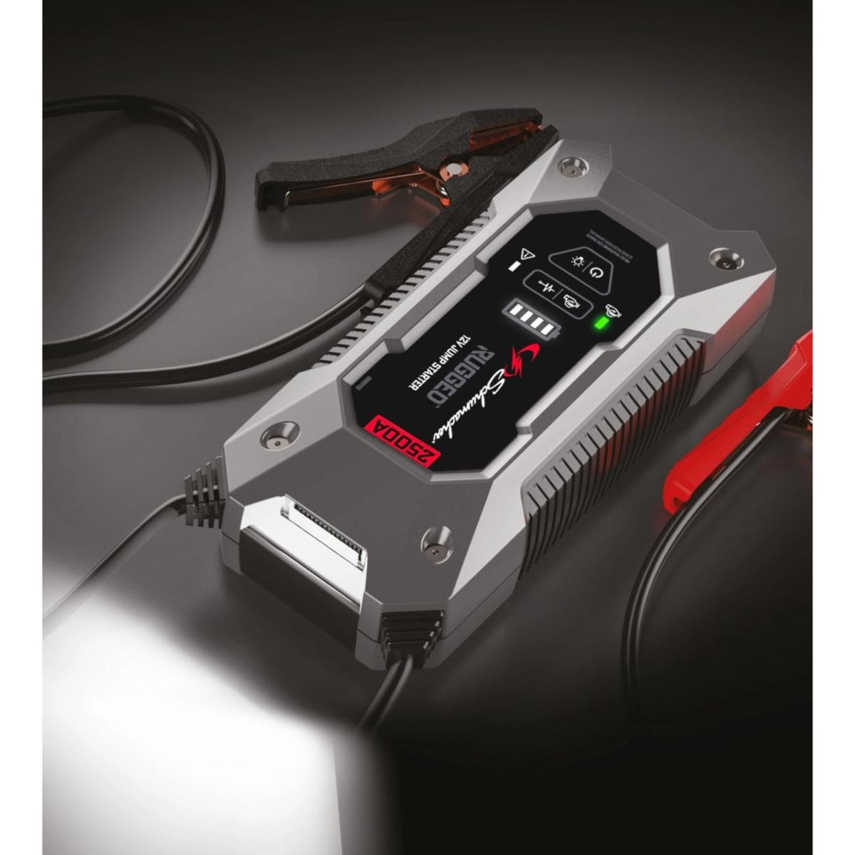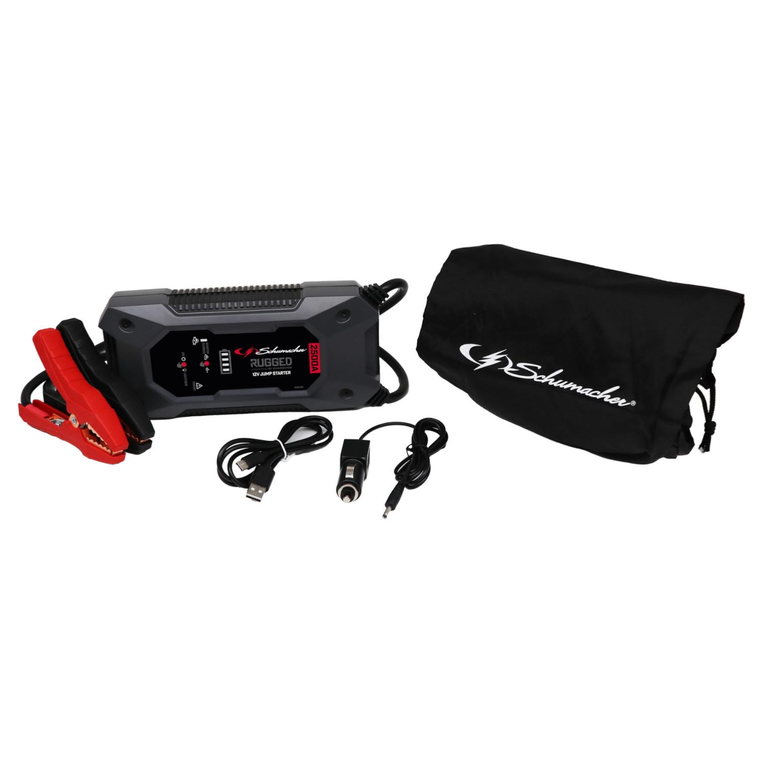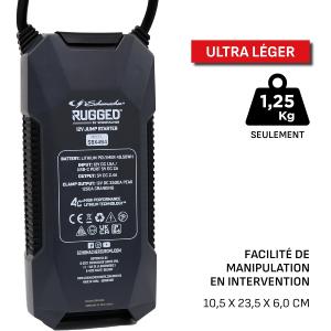 - Technologie 4 cellules : le booster dispose d'une technologie 4 cellules brevetée par Schumacher pour une puissance instantanée accrue jusqu'à 2500A. Il résiste à des températures extrêmes (-20°C > +43°C) et est léger et compact.