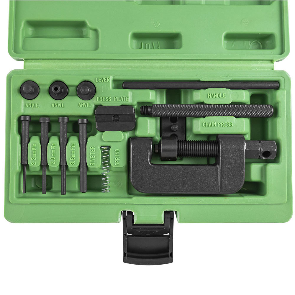 Coffret d'outils pour rive et dérive de chaîne de moto.