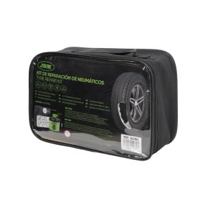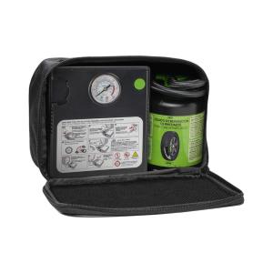 Comprend un produit d'étanchéité liquide, un compresseur pour l'application et une étiquette pour avertir de la limitation de vitesse après l'application du produit.