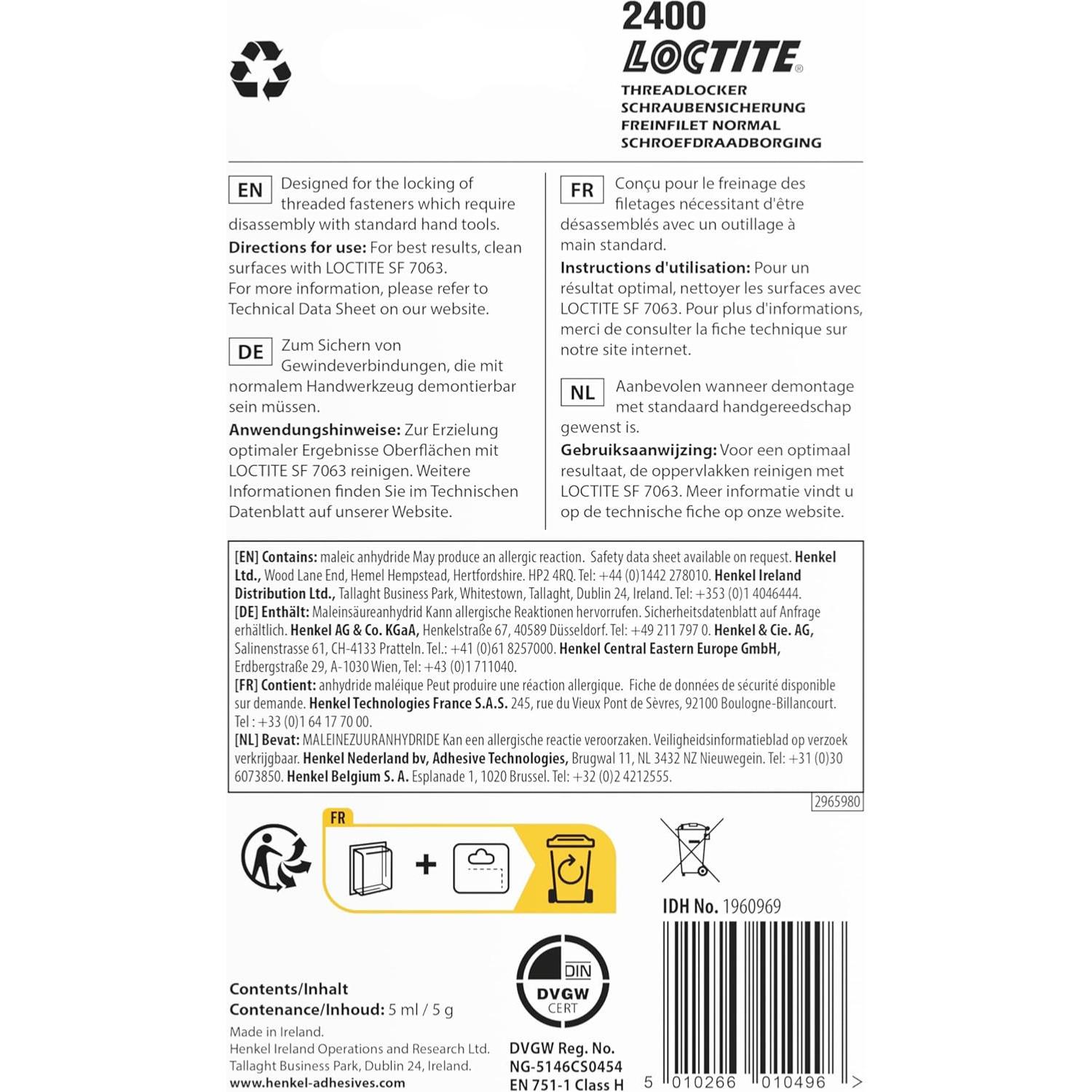 LOCTITE 2400 FREIN FILET MOYEN SANTE ET SECURITE PROFESSIONNEL 5 ml