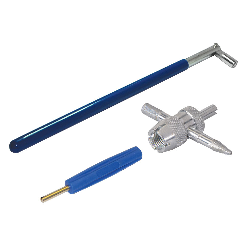Pack d'outils essentiels pour remplacer les valves lors d'un changement de pneus.