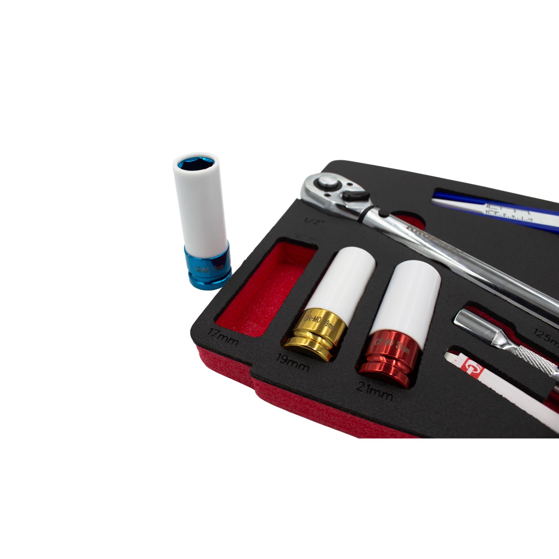 - (3x) Douilles à choc 1/2" pour roues en alliage = 17 mm, 19 mm, 21 mm.