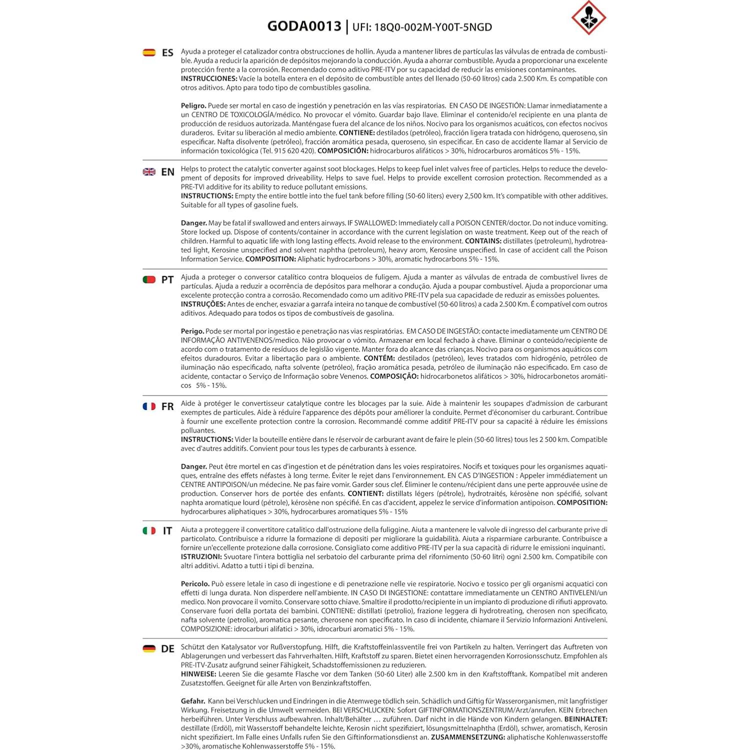 INSTRUCTIONS : Vider la bouteille entière dans le réservoir de carburant avant de faire le plein (50-60 litres) tous les 2.500 km. Compatible avec d'autres additifs. Convient à tous les carburants à essence.